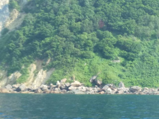 あんなところに砂浜らしいものが見える。山肌からすると崩れて砂浜になるのは想像できますが、大きな石はどうしたんだろーって不思議な景色が堪能できます。